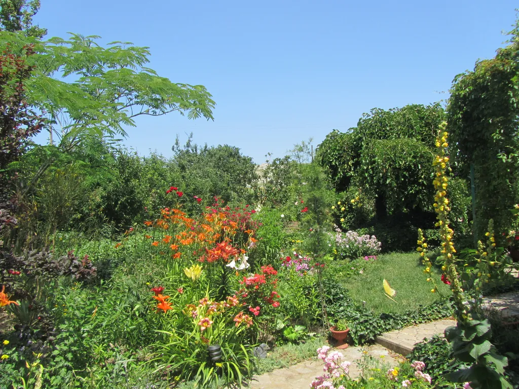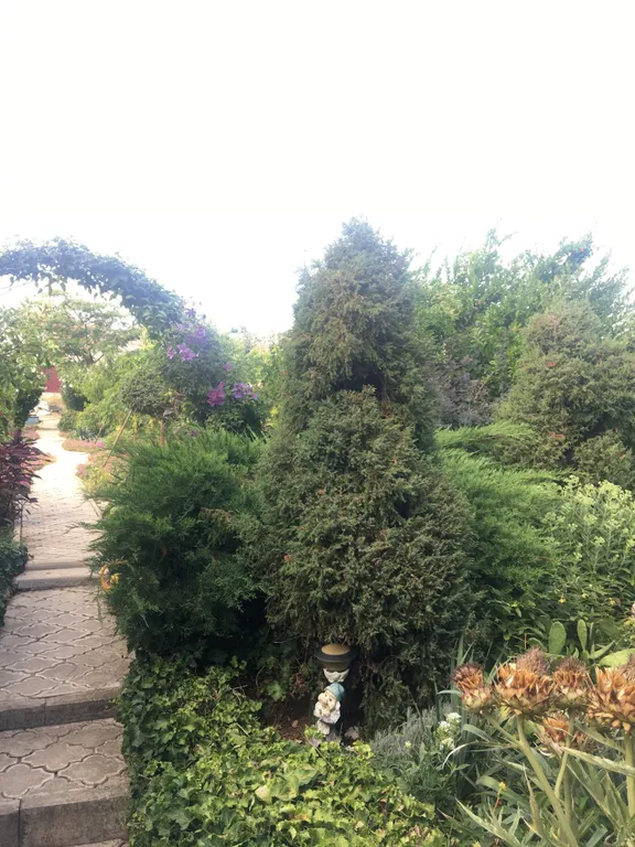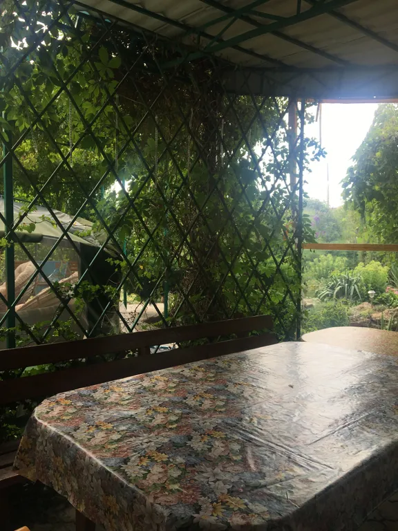 Главный бонус этого варианта заселения дивный сад, в котором мы встретили инжир, гранаты, клубнику, малину, виноград, яблоки, хурму, грецкий орех. Не всё мы попробовали, но всем успели порадоваться. Немного напрягает железная лестница через улицу на второй жилой этаж, при условии что туалет и душ на первом. Но для нас главным критерием было близость к катерному спорту в Татарской бухте, поэтому нам все понравилось.