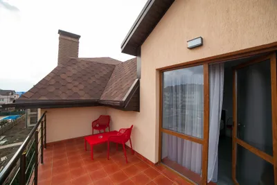 Уютная терраса с шезлонгами и бассейном, где можно расслабиться под теплым крымским солнцем и насладиться прохладительными напитками.