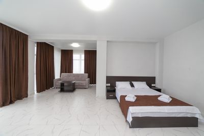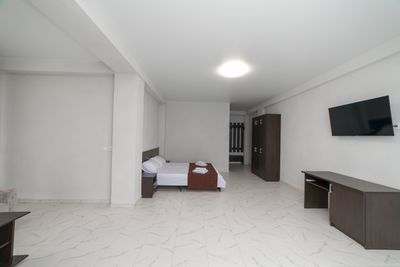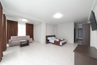 Номерной фонд представлен… несколькими категориями: “стандарт”, “люкс” и “семейный номер”. Каждая из них укомплектована всем необходимым для комфортного проживания, даже на длительный срок. В номерах есть кровати с новыми качественными матрасами, а также набор техники и ванная комната. Интерьер выполнен в спокойной цветовой гамме, что придаёт уют и комфорт. Каждый желающий найдёт для себя отличный номер по доступной цене.
