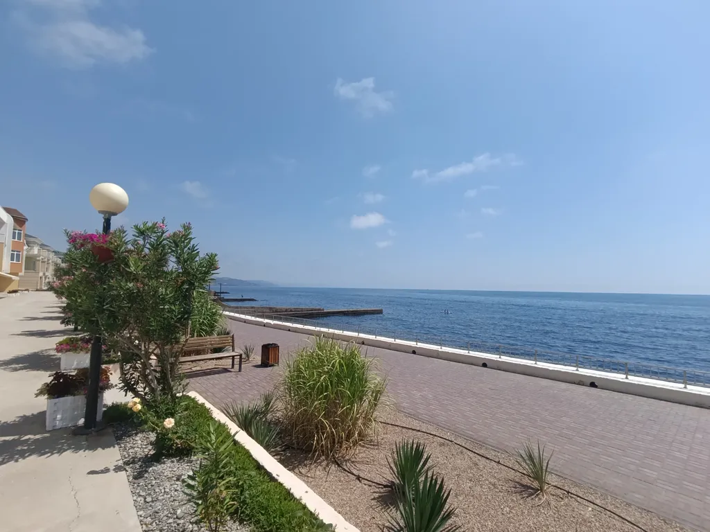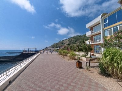 Номер соответствует фото и описанию. Большие площади, в номере есть все необходимое. Есть дворик-веранда, подвесные качели. Столики со стульями. Можно посидеть на шезлонгах и посмотреть на море. Есть зона для шашлыка. Море действительно недалеко. Симпатичная набережная. Есть небольшой магазин продуктов. Пляж с большой галькой, на некоторых участках можно купаться только с пирса. Для взрослых нормально. Для маленьких детей пляж не подходит. Хозяева гостеприимные, если возникали вопросы, сразу все решалось. Нам понравилось.